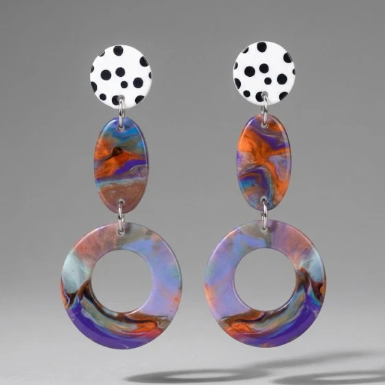 These bold earrings are built for maximum impact: crisp black-and-white polka dot studs, a glossy marbled oval connector, and a big statement hoop drop with dreamy purple, blue, and warm orange swirls. Handmade from high-quality polymer (Fimo) clay, they look dramatic but stay lightweight and wearable.