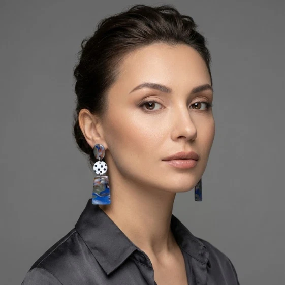 These handmade earrings are a clean mix of graphic and artsy: a glossy marbled top, a crisp black-and-white polka dot centre, and a statement drop with deep ocean blues and warm earthy swirls. Handmade from high-quality polymer (Fimo) clay, they look bold but stay lightweight and comfortable.